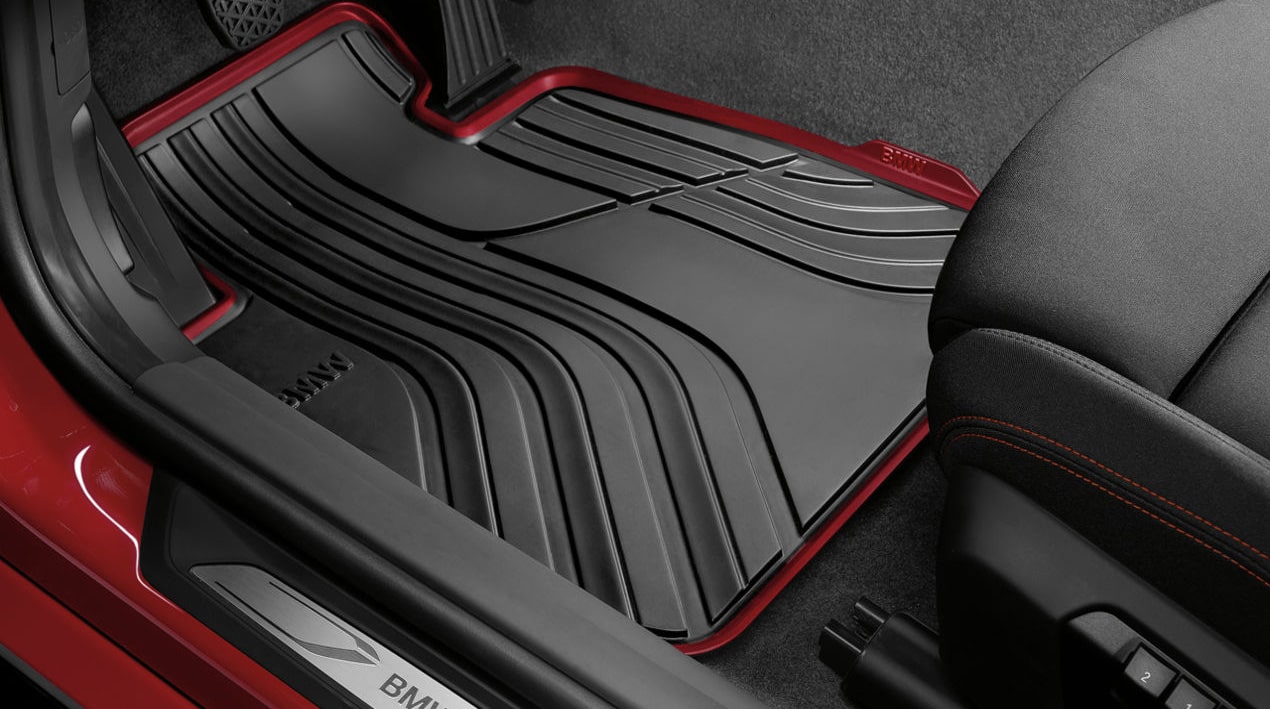 Die passgenauen, strapazierfähigen Allwetter-Fußmatten mit hochgezogenem Rand und formschönem Design schützen den vorderen Fußraum vor Feuchtigkeit und Schmutz. Mit ihrer schwarzen Farbgebung und dem roten Rand passen sie perfekt zum Interieur.