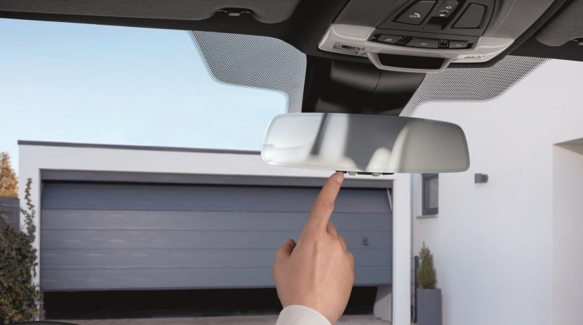 Der rahmenlose Fahrzeuginnenspiegel verfügt über eine integrierte Universalfernbedienung. Sie ist selbstlernend und erlaubt das Öffnen und Schließen von beispielsweise Garagen- und Grundstückstoren vom Fahrzeug aus.