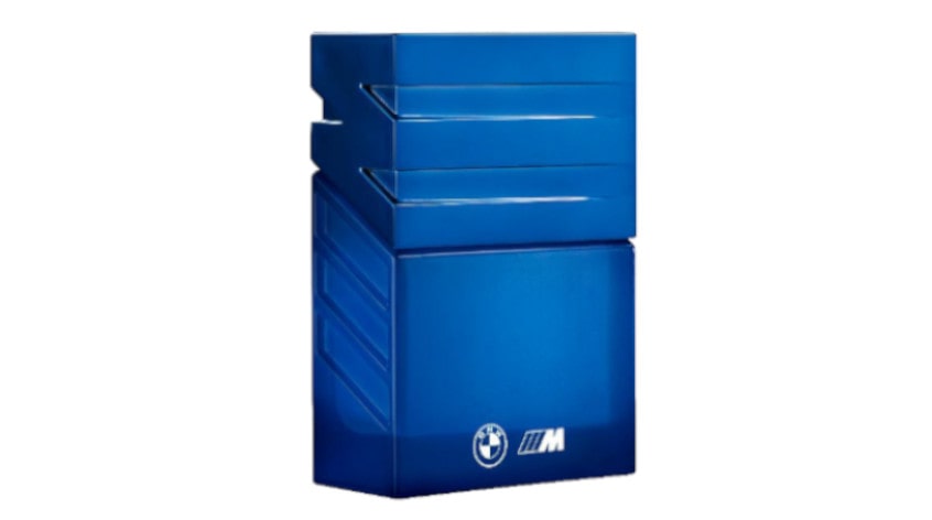 Reduziertes Flakondesign in Blau, angelehnt an den zweiten Streifen des BMW M Logos
