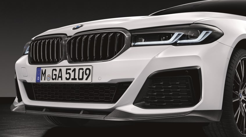 Der M Performance Frontaufsatz aus Carbon betont den sportlichen Auftritt des 5er BMW Facelifts und lässt die Front deutlich kraftvoller wirken. Das Design des dreiteiligen Frontaufsatzes lässt die Front deutlich kraftvoller wirken. Die Anbindung über die zwei Mittelfüße am Stoßfänger vorn verleiht dem Frontaufsatz einen zusätzlichen Blickfang.
