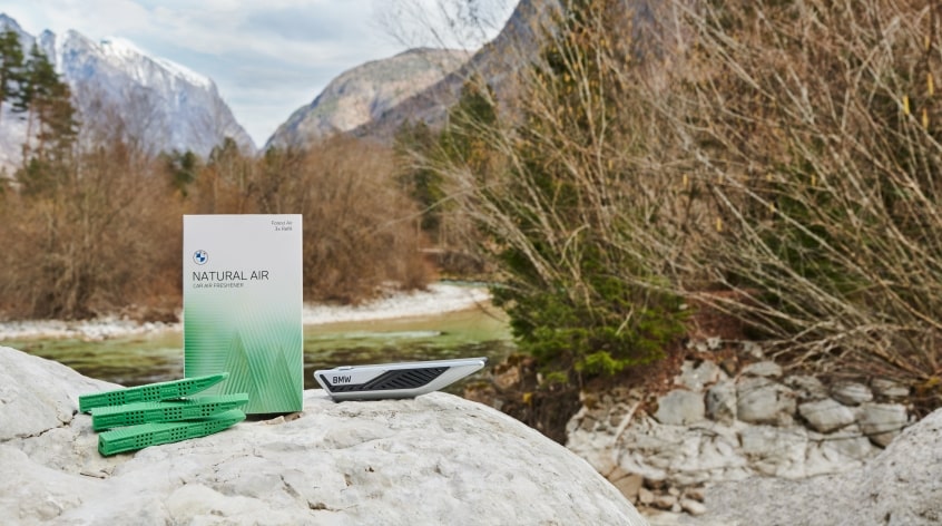 Die exklusive Innenraumduftlinie Natural Air wurde speziell für BMW entwickelt und setzt sich aus einem regulierbaren Dufthalter und austauschbaren Duftsticks zusammen. Die Duftnoten „Relaxing Ocean“, „Mountain View“, „Forest Air“ und „Endless Desert“ sowie die LIMITED EDITIONS ermöglichen dem Kunden die Individualisierung des Fahrzeuginnenraums und entfachen ein wohltuendes Dufterlebnis auf allen Reisen. Das Starter-Kit besteht aus einem Halter, der an den Lüftungsgittern im Fahrzeuginnenraum aller BMW Modelle angebracht werden kann und einem austauschbaren Duftstick der Duftrichtung „Mountain View“. Die Intensität der Düfte lässt sich über den Luftstrom, sowie durch die im Dufthalter integrierten Fenster individuell regulieren. Alle Duftsticks sind jeweils separat in einem luftdichten Sachet verpackt – so bleiben die Düfte längst möglich erhalten.